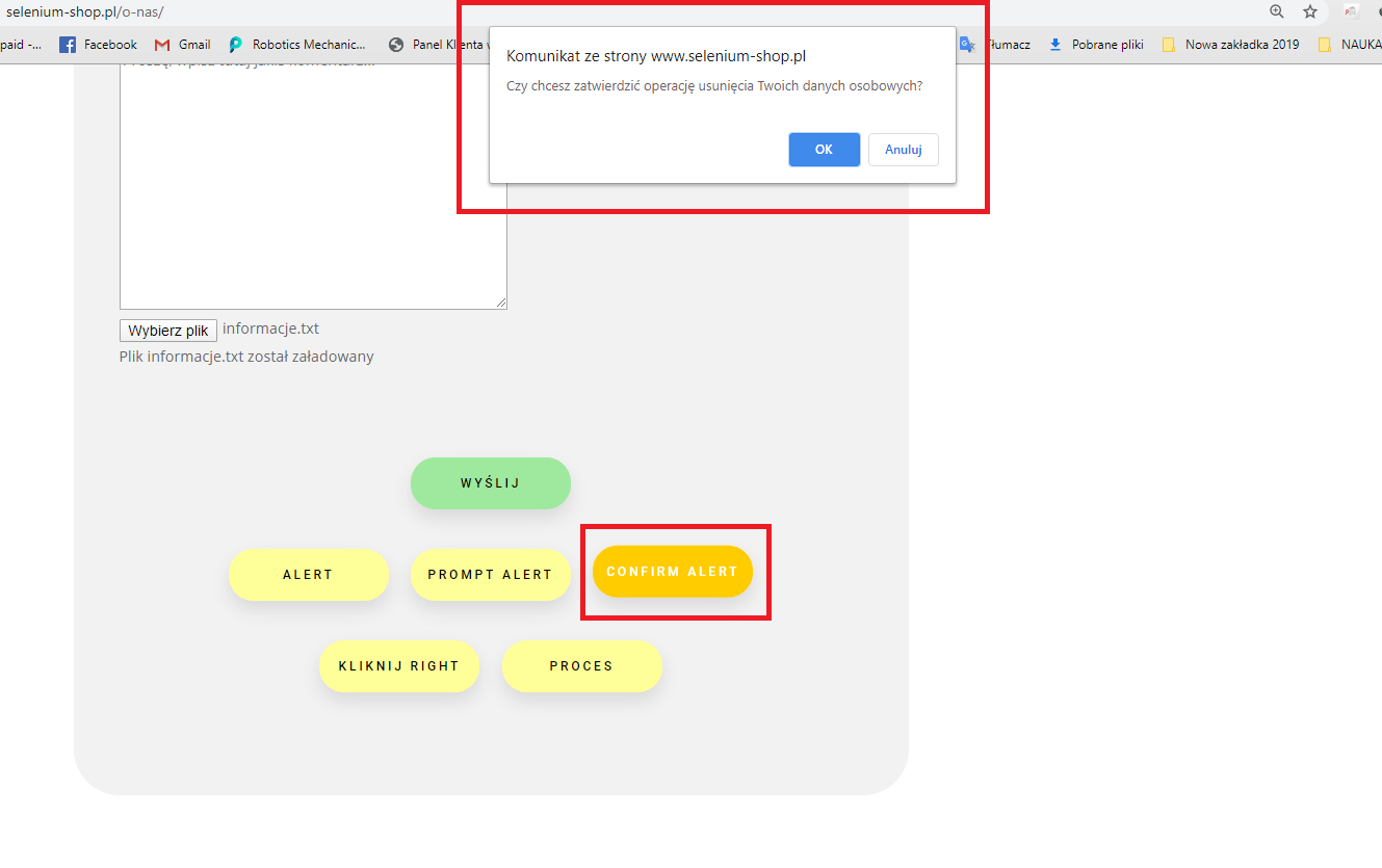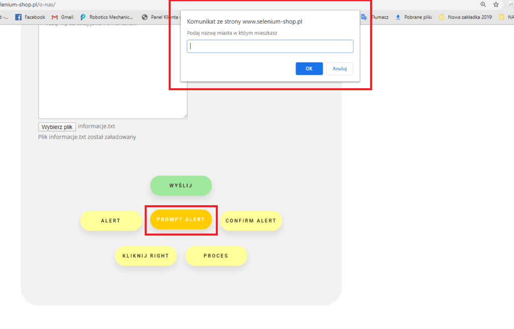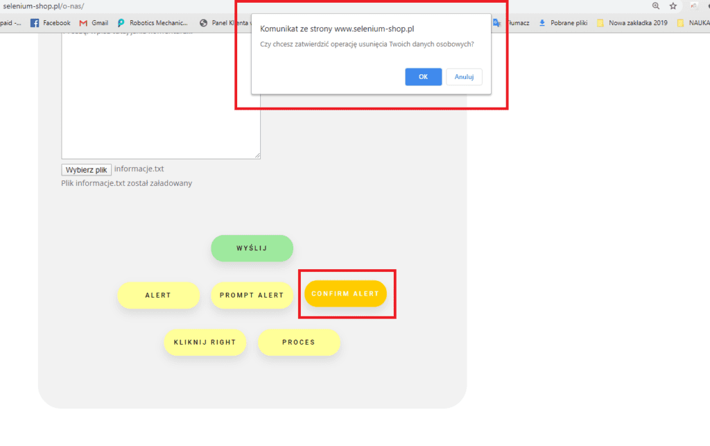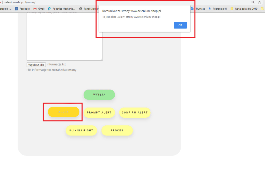 Wszystkie typy okien alert istnieją na naszej stronie testowej, dlatego zachęcam do samodzielnej pracy i praktycznego przestudiowania każdego z przykładów pokazanych w tym module.