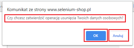 W naszym przypadku pytanie alertu brzmi: „Czy chcesz zatwierdzić operacje usunięcia Twoich danych osobowych?”