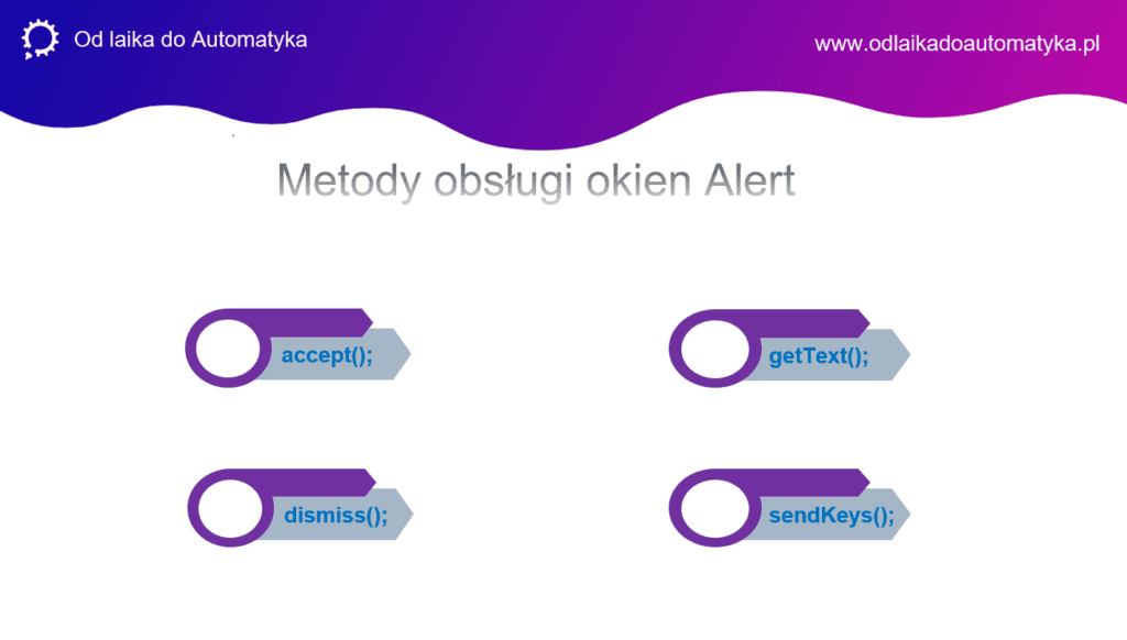Selenium WebDriver dostarcza nam gotowych metod do obsługi kluczowych operacji okien Alert: