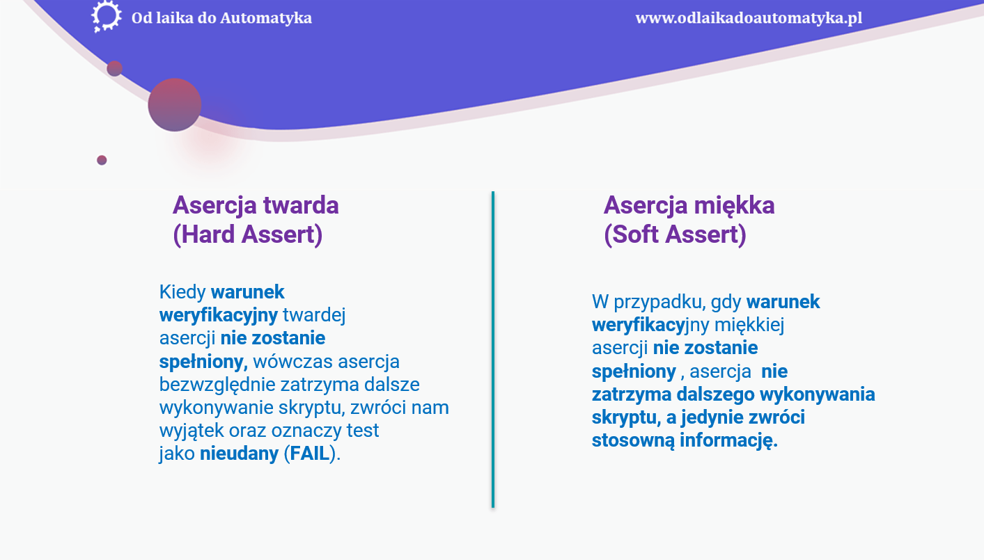 I właśnie np. dla takiego testu przycisku 'KUP TERAZ’, powinniśmy zastosować weryfikację twardą, ponieważ, jeśli przycisk nie zadziała właściwie (nie przeniesie nas na stronę zakupową), wówczas cały dalszy test nie ma sensu i na pewno zakończy się niepowodzeniem. Asercja twarda zwróci nam od razu błąd i zakończy działanie testu z wynikiem FAILED.