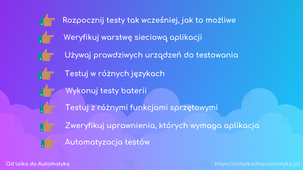 Dlatego ważne jest, aby podczas testów stosować najlepsze wypracowane przez rynek techniki wspierające testy. Poniżej przedstawiam 8 najlepszych praktyk (Best Practices) testowania aplikacji mobilnych.
