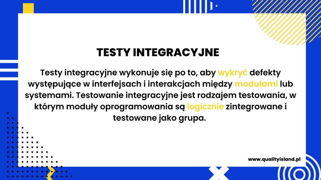Testy integracyjne wykonuje się po to, aby wykryć defekty występujące w interfejsach i interakcjach między modułami lub systemami. Testowanie integracyjne jest rodzajem testowania, w którym moduły oprogramowania są logicznie zintegrowane i testowane jako grupa.