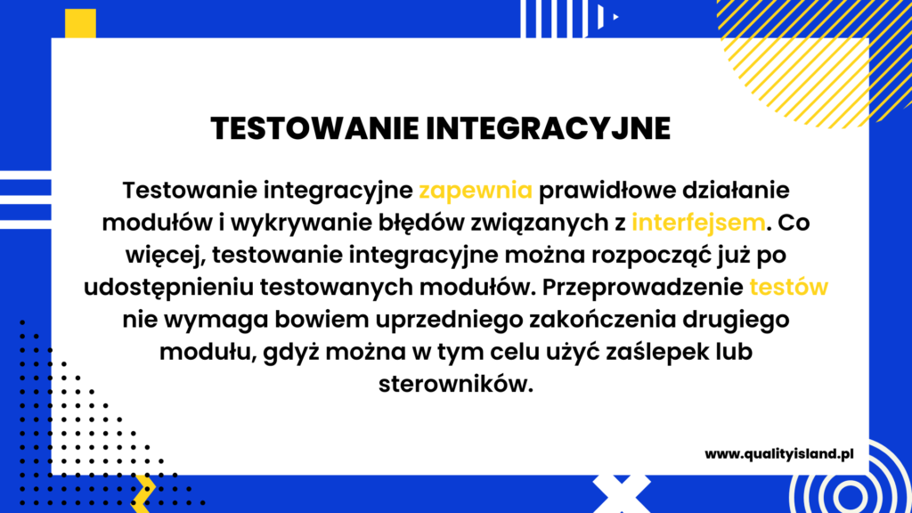 Testowanie integracyjne zapewnia prawidłowe działanie modułów i wykrywanie błędów związanych z interfejsem. Co więcej, testowanie integracyjne można rozpocząć już po udostępnieniu testowanych modułów. Przeprowadzenie testów nie wymaga bowiem uprzedniego zakończenia drugiego modułu, gdyż można w tym celu użyć zaślepek lub sterowników.