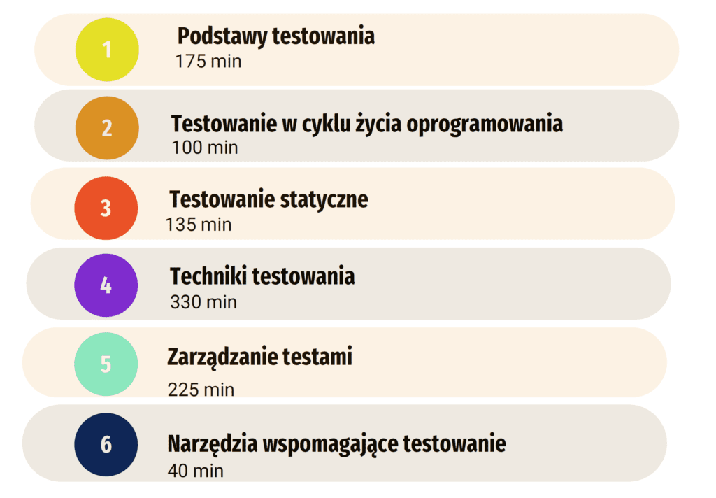 ISTQB® Certyfikowany Tester – Poziom Podstawowy – Sylabus podzielony jest na 6 głównych modułów tematycznych: