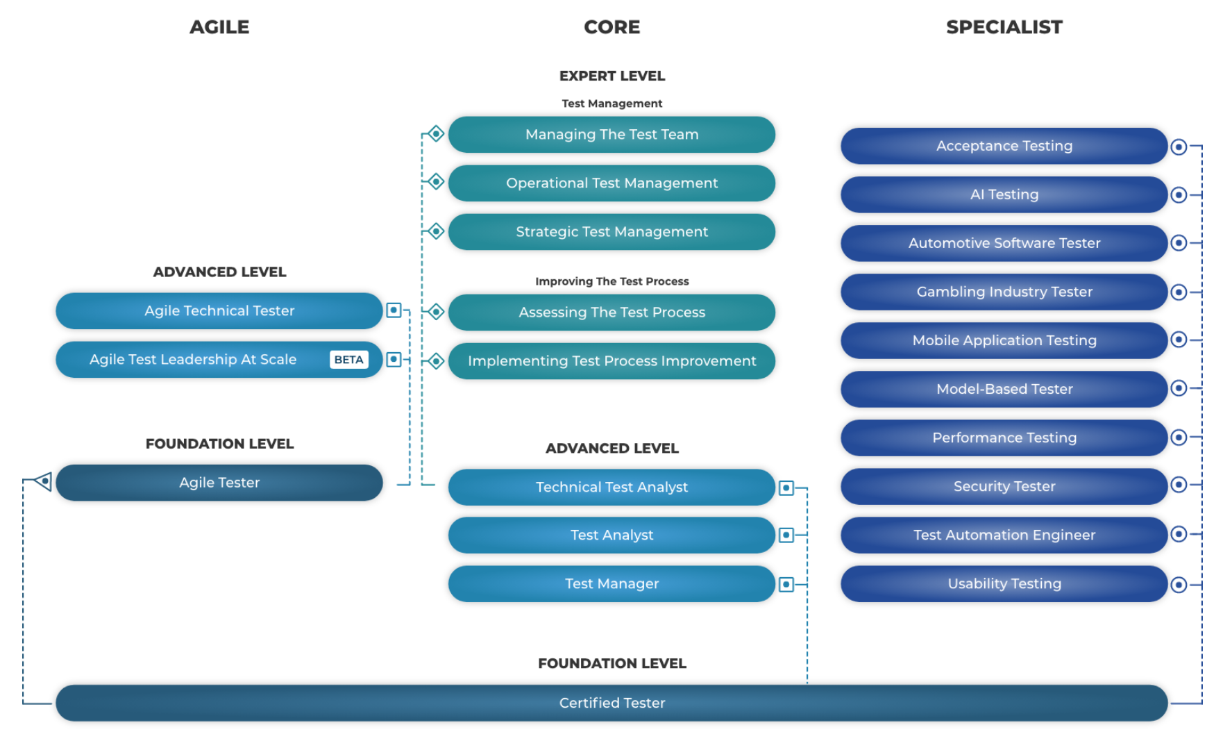 W zakresie ISTQB wyróżniamy kilka poziomów certyfikacji. Oczywiście pierwszym, najbardziej podstawowym i najpopularniejszym poziomem jest ISTQB® Certyfikowany Tester – Poziom Podstawowy. Jest on o tyle ważny, iż jest wymagany, aby aspirować do kolejnych poziomów certyfikacji. Następną opcją do wyboru jest specjalistyczny poziom podstawowy. Korzyścią z jego uzyskania jest potwierdzenie umiejętności z wybranego, konkretnego zakresu. Tutaj mamy do wyboru: