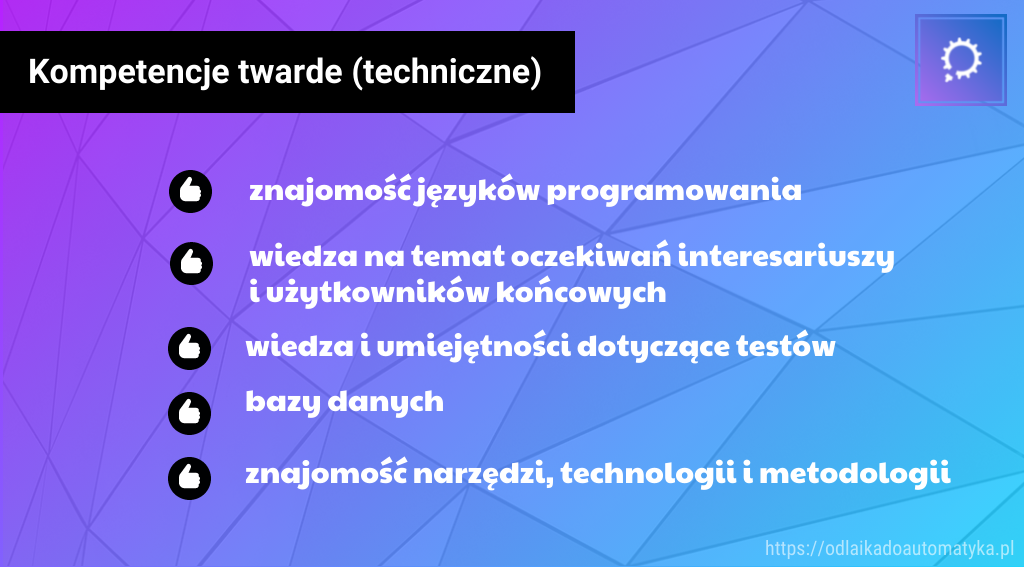 - wiedzy o środowisku technicznym, która zawiera znajomość wszystkiego tyczącego się aplikacji – od systemu operacyjnego po narzędzie automatyzacji,