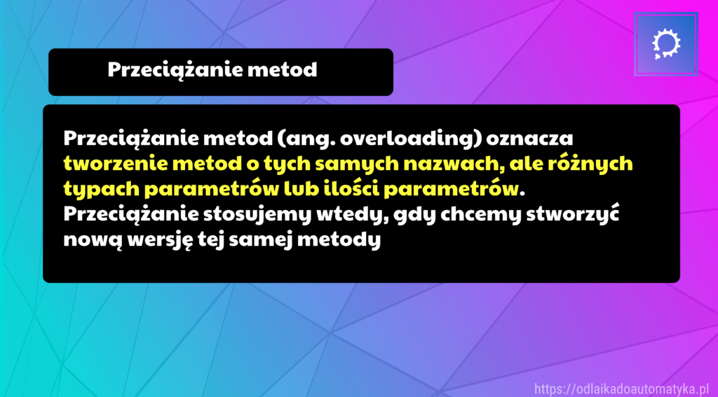 Przeciążanie metod (ang. overloading) oznacza tworzenie metod o tych samych nazwach, ale różnych typach parametrów lub ilości parametrów. Przeciążanie metod stosujemy wtedy, gdy chcemy stworzyć nową wersję tej samej metody.