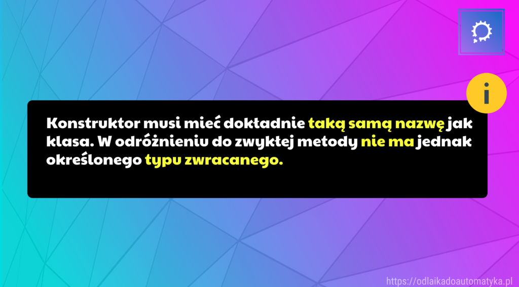 - Konstruktor tym różni się od zwykłej metody, że nie zawiera określonego typu zwracanego.