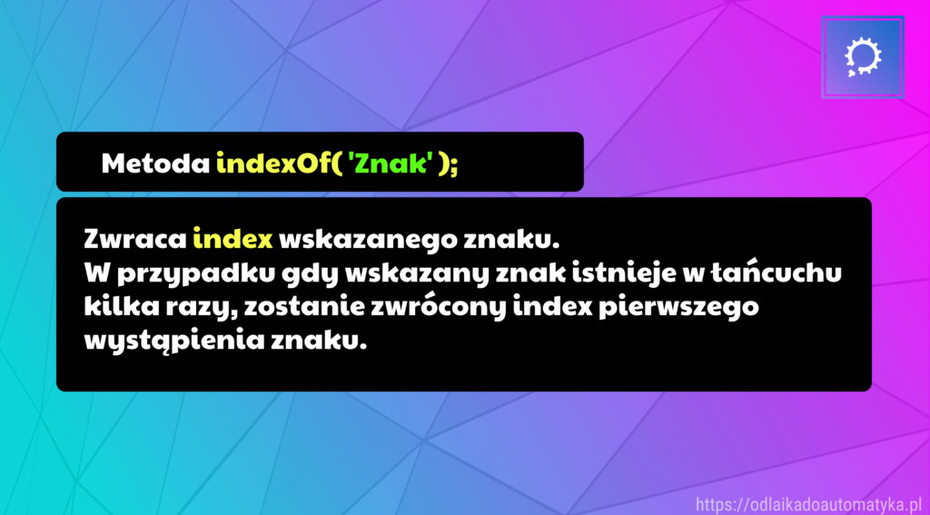 Metoda indexOf(’znak’); zwraca index wskazanego znaku. W przypadku, gdy wskazany znak istnieje w łańcuchu kilka razy, zostanie zwrócony index pierwszego wystąpienia znaku.
