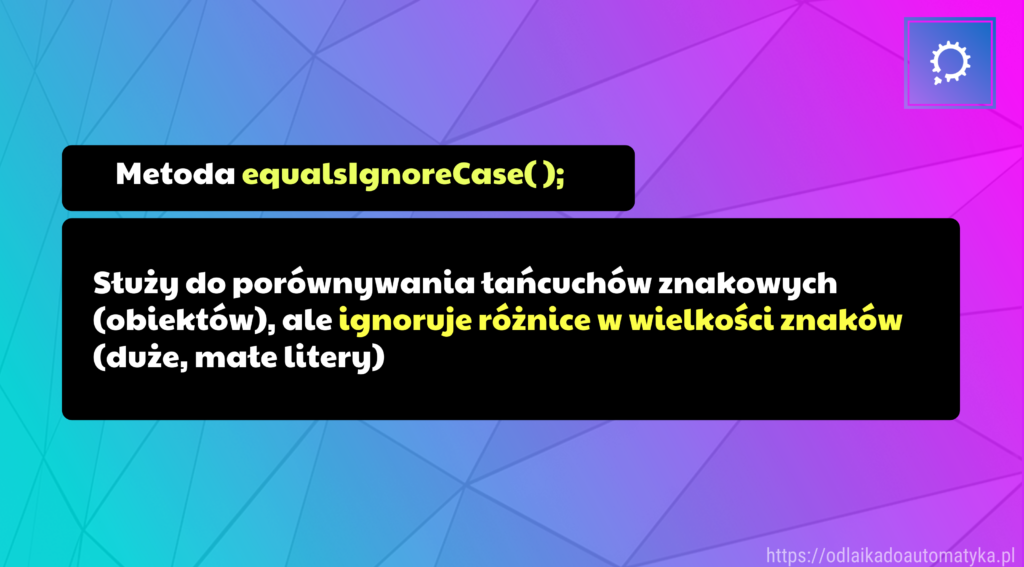 Metoda equalsIgnoreCase() służy do porównywania łańcuchów znakowych (obiektów), ale ignoruje różnice w wielkości znaków (duże, małe literty).