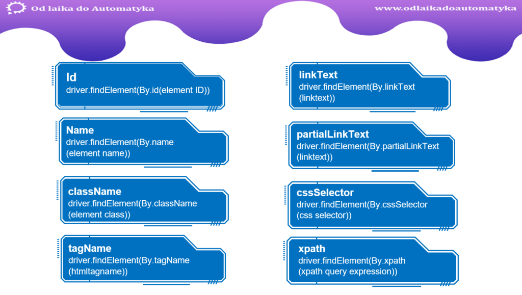 • linkText -> driver.findElement(By.linkText(”Selenium Shop Automatyzacja Testów”);