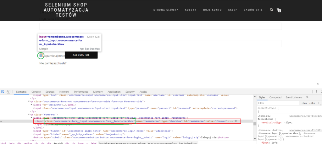 Cel: Zlokalizować checkboxa przy labelce „Zapamiętaj mnie”