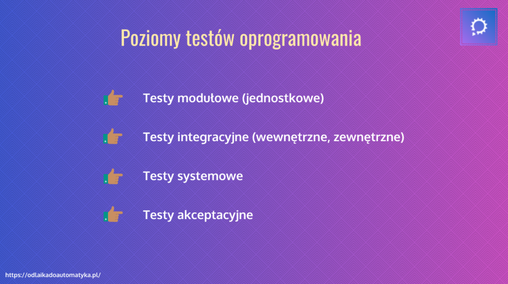 Testy możemy podzielić na następujące 4 podstawowe poziomy: