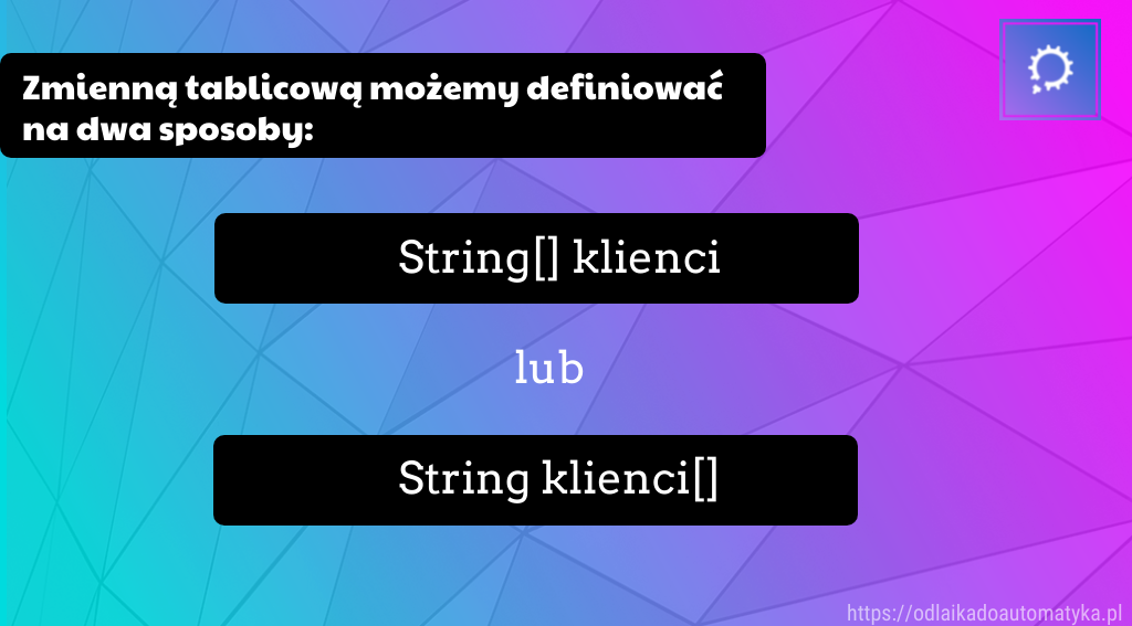 - Zmienne tablicowe możemy zadeklarować podobnie jak inne zmienne z [] po typie danych.