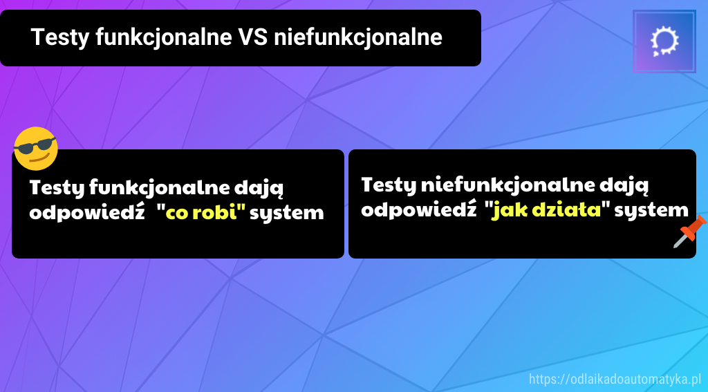 | Testy funkcjonalne opisują, „co robi” system | Testy niefunkcjonalne opisują, „jak działa” system |